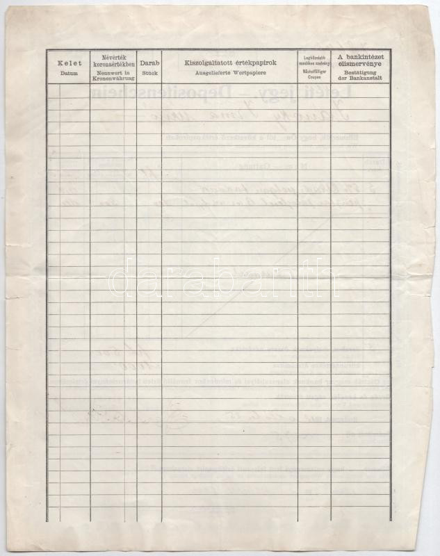 Leírás: Budapest 1918-1926. "Osztrák-magyar bank" kitöltött letéti jegye T:III szakadások, kis ceruzás firka