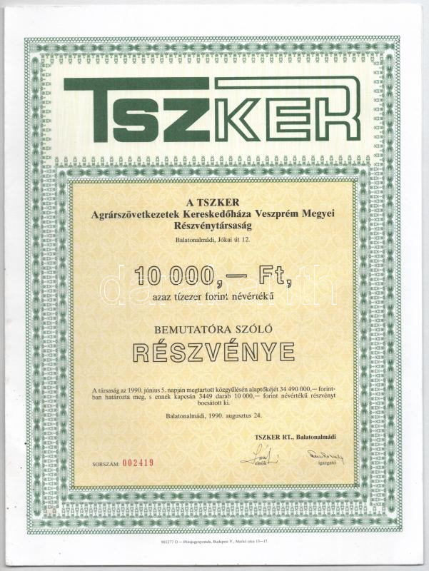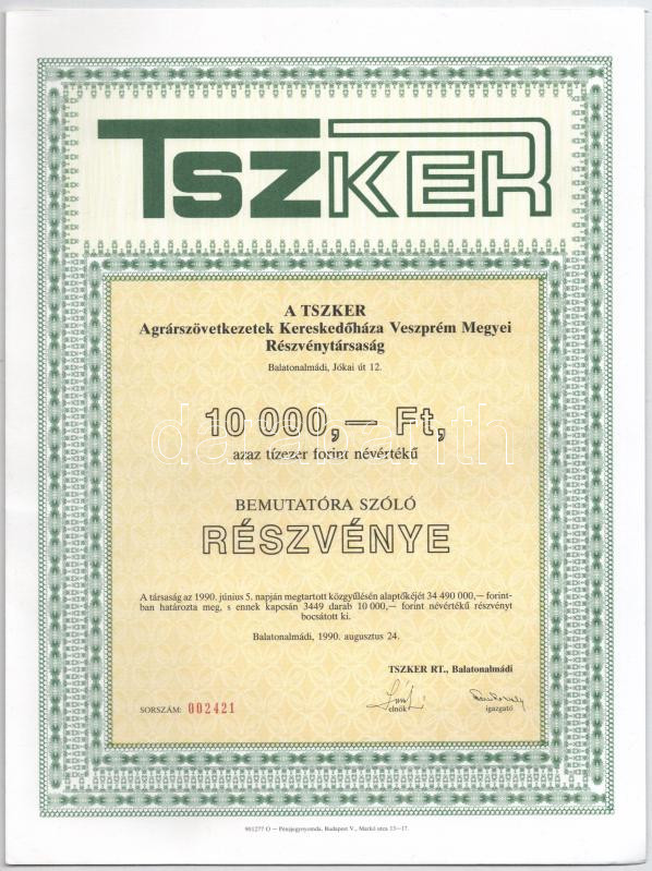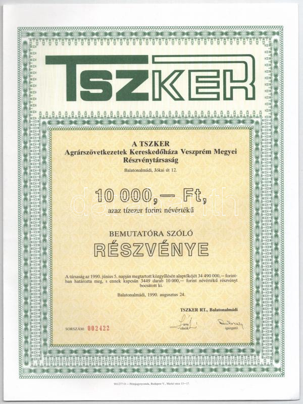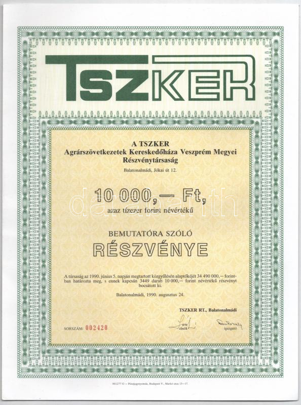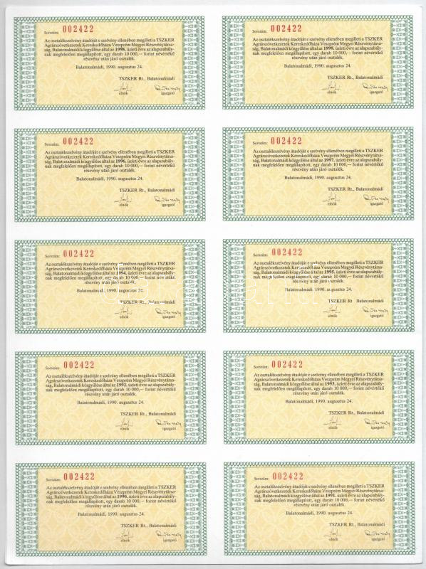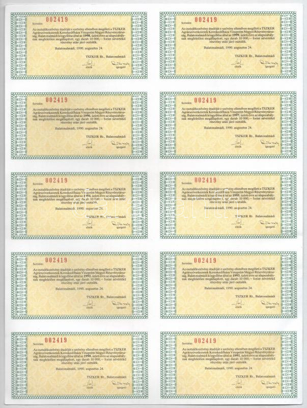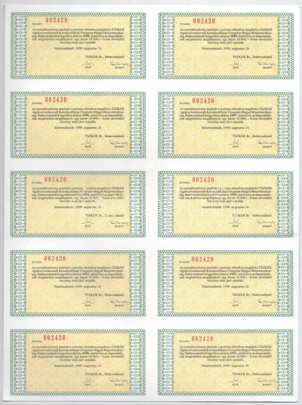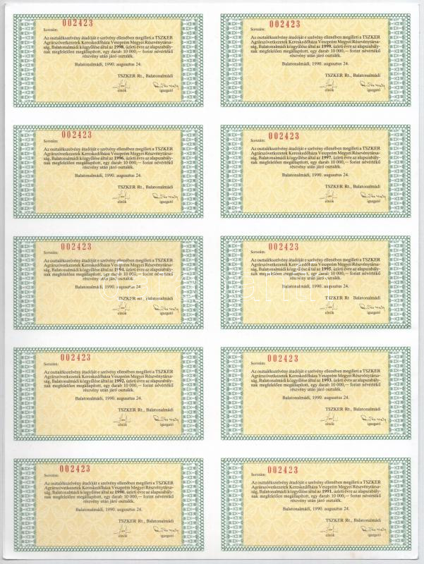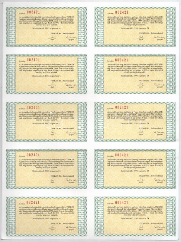 Budapest 1990. "A TSZKER Agrárszövetkezetek Kereskedőháza Veszprém Megyei Részvénytársaság" bemutatóra szóló részvénye 10.000Ft-ról (5x) sorszámkövetők, szelvényekkel T:I,I-
