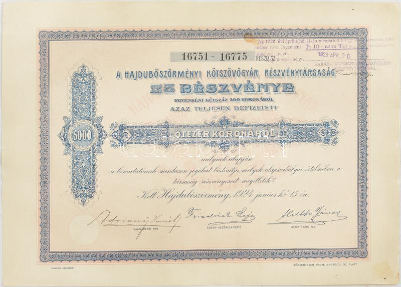 Leírás: Hajdúböszörmény 1924. "Hajdúböszörményi Kötszövőgyár Részvénytársaság" 25 részvénye összesen 5000K-ról, szelvényekkel, felülbélyegzéssel, szárazpecséttel T:II folt