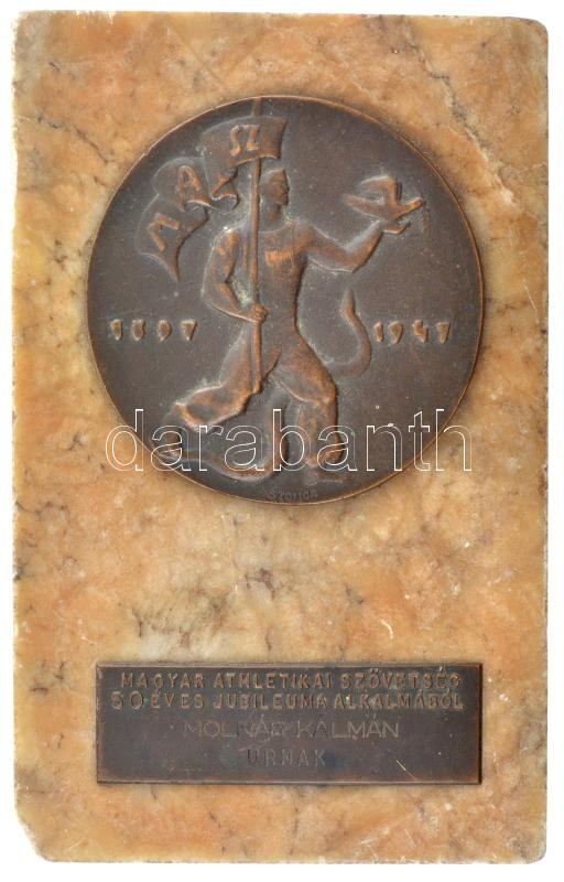 1947. "MASZ 1897-1947 - Magyar Athletikai Szövetség 50 éves jubileuma alkalmából - Molnár Kálmán úrnak" egyoldalas bronz emlékérem- és plakett, gravírozott felirattal, márványalapzatra erősítve. A márvány hátoldalán "Ludvig Éremverő" papírcetlivel. Szign.: Szomor László (emlékérem:73mm, plakett:21x71mm, talapzat:152x100mm) T:2,2- a márványból több darab letört