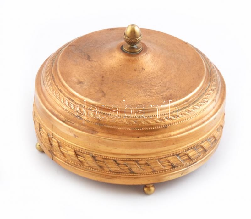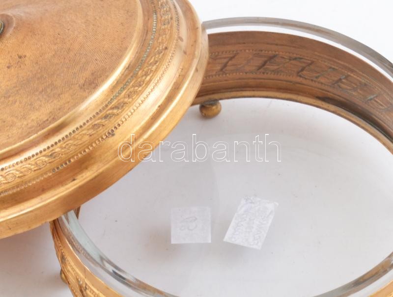 Leírás: Francia tűziaranyozott cukortartó, üvegbetéttel, 1920 körül, kopásnyomokkal, m: 10 cm