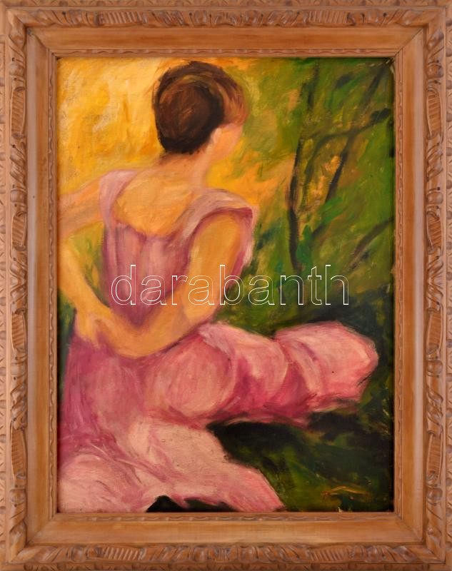 Leírás: Benkhard jelzéssel: Hölgy a tájban. Olaj, karton. Hátoldalán román kiviteli bélyegzővel. Dekoratív fakeretben. 75x55 cm