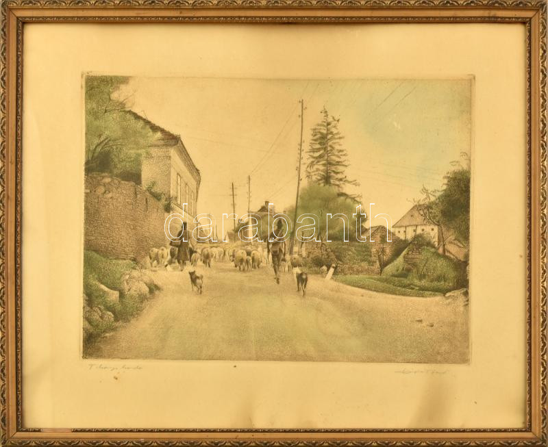 Leírás: Dudás Jenő (1900-1991): Tihanyi konda. Színezett rézkarc, papír, jelzett. Dekoratív, üvegezett, kissé sérült fakeretben, 28x37,5 cm