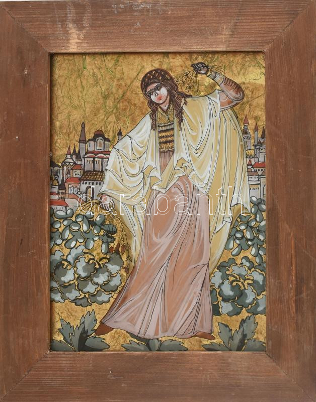 Leírás: Mihaela Nacu (1952-2021): Női szent. Üvegikon, kézzel festett. Jelzett a hátoldalán. 22x16 cm. Fakeretben.