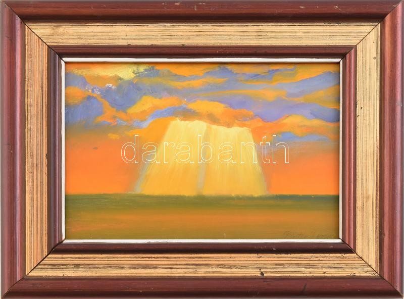 Leírás: Pintér József (1922-2002): Fényözön. Olaj, farost. Jelzett. Hátoldalon címkén autográf felirattal. Dekoratív, üvegezett fa keretben. 16x22,5 cm