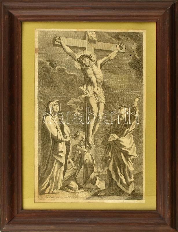 Jézus a kereszten, 1739. Rézmetszet, papír. Jelzett a metszeten (Jos. Ant. Zimerman). Kissé foltos és kissé sérült. Missae defunctorum juxta usum ecclesiae romanae... c. könyvből. Üvegezett fakeretben. 29x18 cm