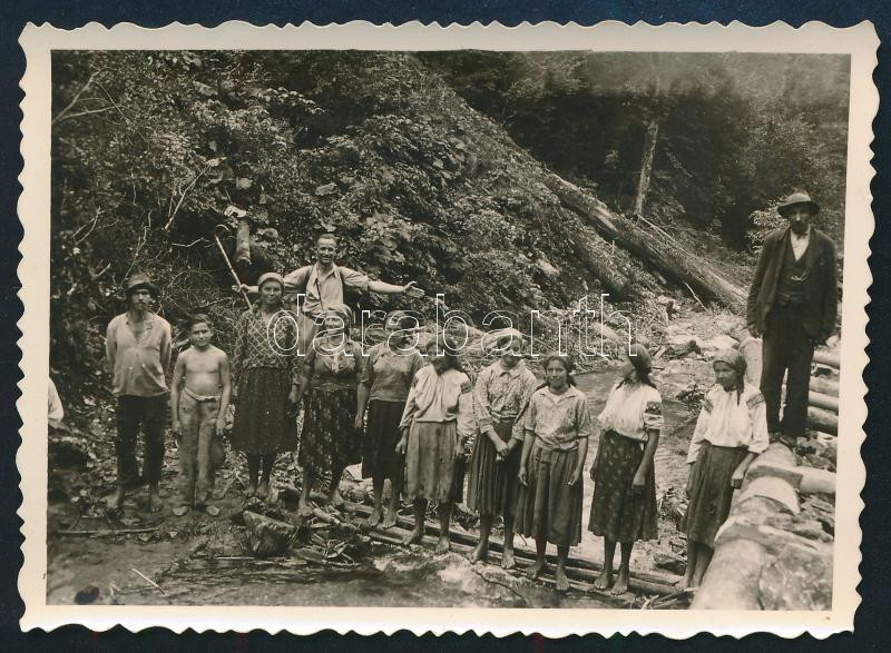 Leírás: 1942 Ruszin nők a kárpátaljai Terebesfejérpataknál gátmunkán, hátoldalon feliratozott fotó, 6×8 cm