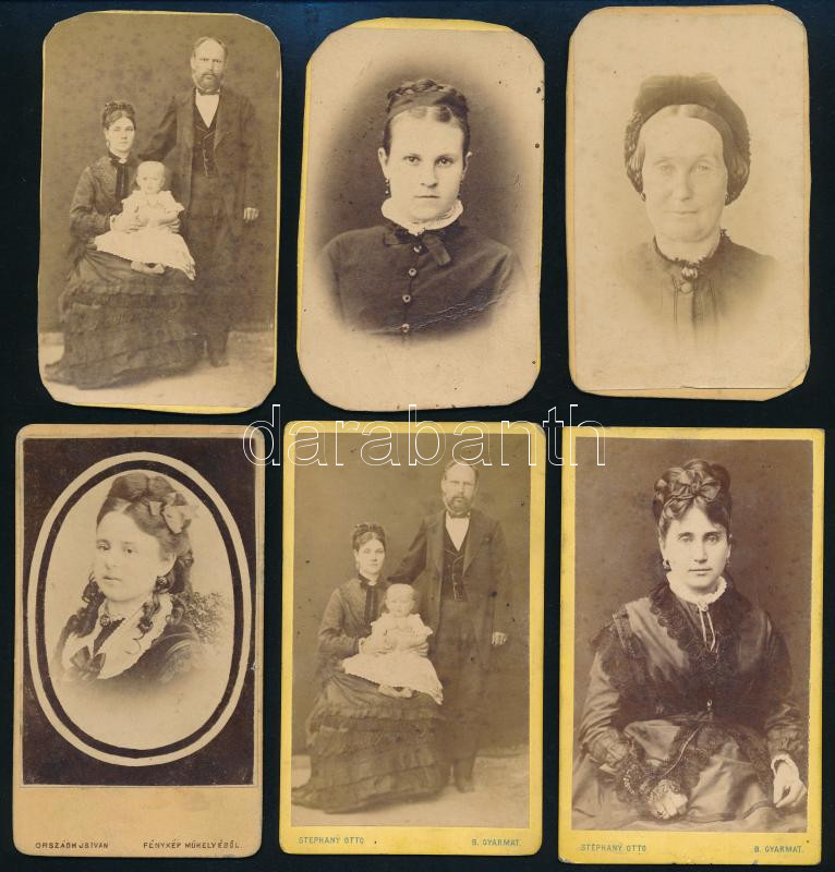 cca 1870-1890 össz. 8 db portré balassagyarmati műtermekből (Országh István, Stephany Otto, Szkladányi Károly), keményhátú vintage fotók, részben körbevágva és kissé kopott, 9,5x6 és 10,5x6,5 cm közötti méretekben