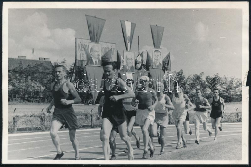 cca 1950 Maratoni bajnokság (futóverseny), a versenyzők mögött Lenin, Rákosi és Sztálin arcképeivel, fotó, a hátoldalon feliratozott, pecséttel jelzett (Pobuda Foto Bp.), szélén kis sérüléssel, 18x12 cm
