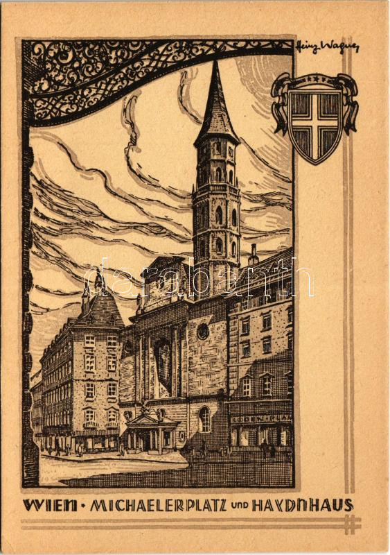 Wien, Vienna, Bécs; Michaelerplatz und Haydnhaus s: Heinz Wagner (EK) https://www.darabanth.com/hu/429-Gyorsarveres/429.0/Kepeslapok/Ausztria~1500020/Wien-Vienna-Becs-Michaelerplatz-und-Haydnhaus-s-Heinz-Wagner-EK~II2751437
