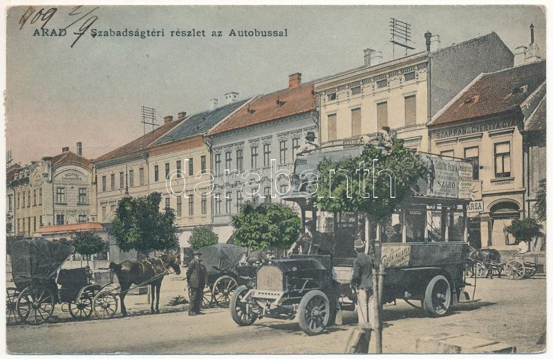 Leírás: 1909 Arad, Szabadság tér, autóbusz üzletek reklámjaival, szappan és gyertyagyár, Rozsnyay gyógyszertár. Ifj. Klein Mór kiadása / square, autobus with shop advertisements, soap and candle factory, pharmacy (EK)
