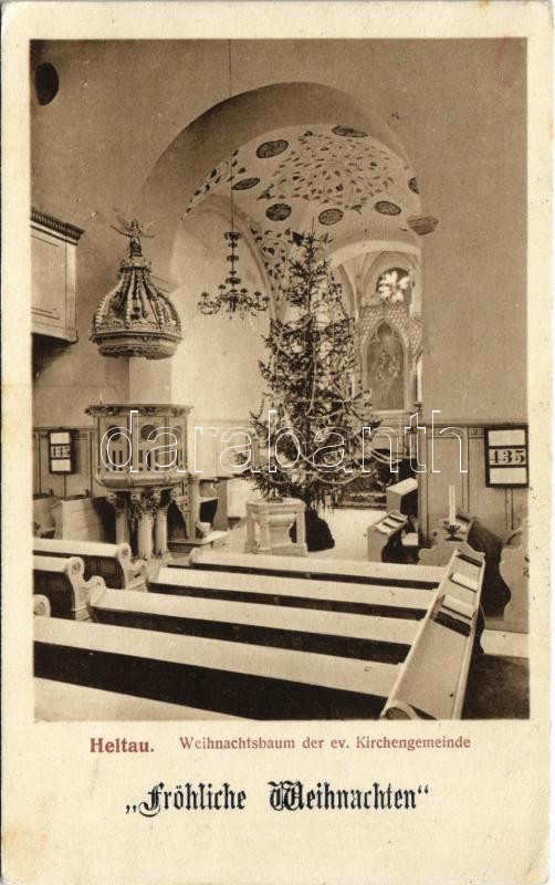 1915 Nagydisznód, Heltau, Cisnadie; Weihnachtsbaum der ev. Kirchengemeinde. Fröhliche Weihnachten / Karácsonyfa az Evangélikus templomban. Karácsonyi üdvözlet. Verlag der Heltauer Heimatsmuseums. Druck von Jos. Drotleff / Christmas tree in the Lutheran church, Christmas greeting (EK)