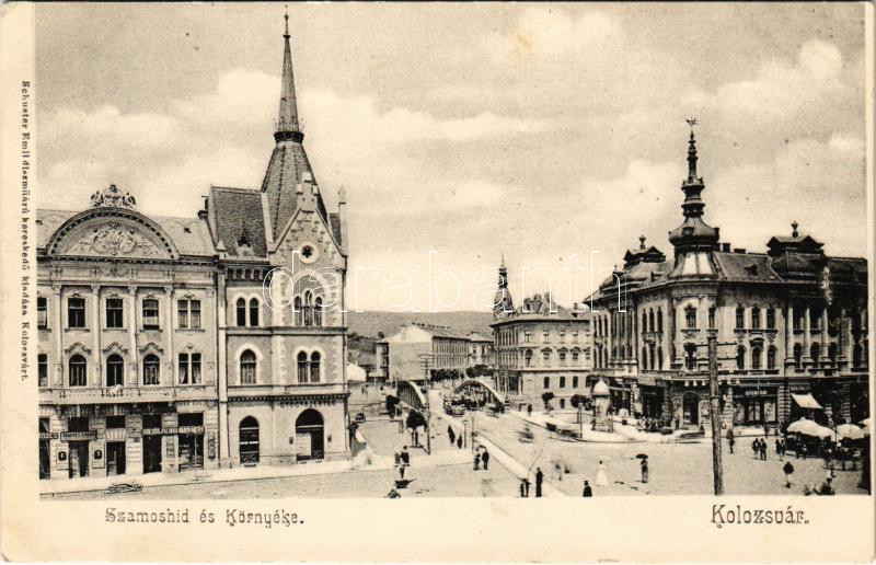 Leírás: Kolozsvár, Cluj; Szamos híd és környéke, gyógyszertár, Wertheimer Vilmos, Kőmíves Andor üzlete, piac. Schuster Emil kiadása / bridge, pharmacy, shops, market (b)