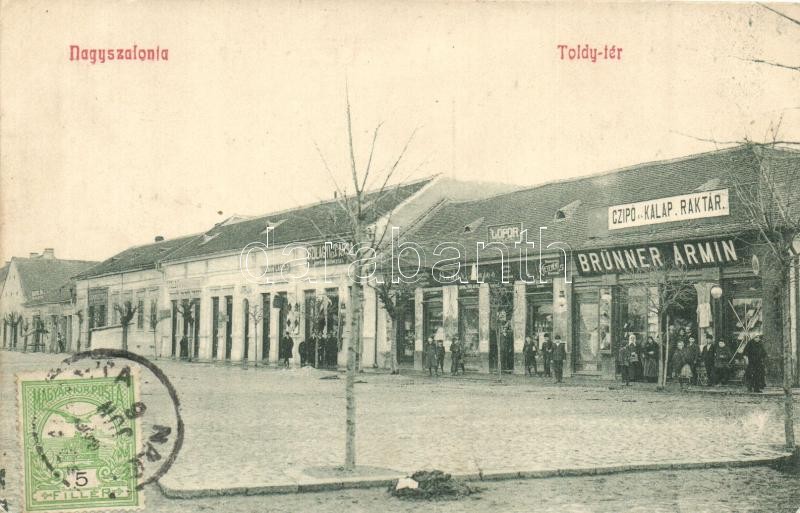 Nagyszalonta, Salonta; Toldy tér, Brünner Ármin, Szilágyi és Társa, Badar Lajos, Kálmán László, Kertész Pál üzlete, Gyógyszertár, Toldi vendéglő, étterem. Patócs János 434. / square, shops, pharmacy, restaurant. TCV card