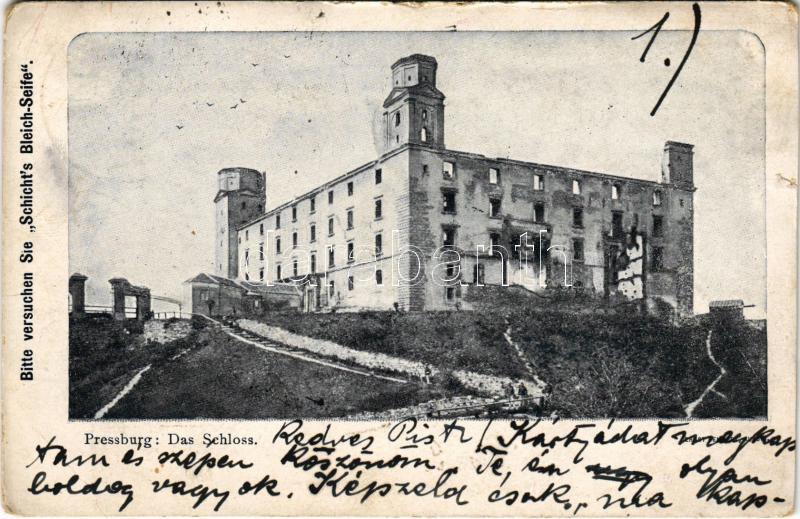 Leírás: 1900 Pozsony, Pressburg, Bratislava; Das Schloss. Bitte versuchen Sie "Schicht's Bleich-Seife" / vár, szappan reklám / castle, soap advertisement (kis szakadás / small tear)