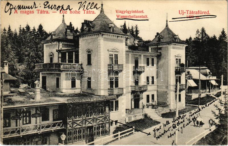 Leírás: 1909 Újtátrafüred, Neu-Schmecks, Novy Smokovec (Magas-Tátra, Vysoké Tatry); vízgyógyintézet. Divald Károly műintézete 1490-1908. / spa, bath, sanatorium (EK)
