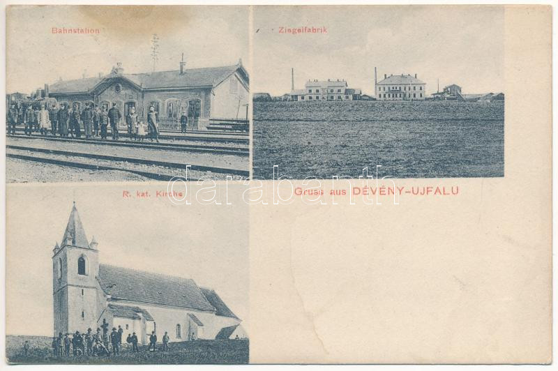 1912 Dévényújfalu, Dévény-Újfalu, Theben-Neudorf, DevÃnska Nová Ves (Pozsony, Bratislava); Bahnstation, Ziegelfabrik, Kirche / vasútállomás, gÅ‘zmozdony, vonat, római katolikus templom, téglagyár / railway station, locomotive, train, brick factory, church (fl)