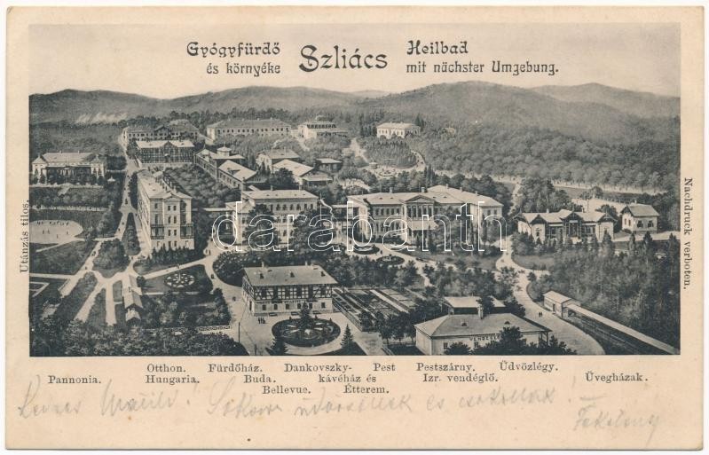 Szliács, Sliac; Pannonia, Otthon, Hungaria, Fürdőház, Buda, Bellevue, Bristol, Újpest, Huszka vendéglő, Amália, Strauss, Dankovsky kávéház és étterem, Pest és Pestszárny szálloda, Izraelita vendéglő, Üdvözlégy, Üvegház kertész lak / hotels, Jewish restaurant, greenhouse, café, villa (EK)