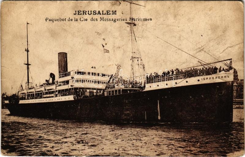 1926 "Jerusalem" Paquebot de la Cie des Messageries Maritime... https://www.darabanth.com/hu/429-Gyorsarveres/429.0/Kepeslapok/Hajo~1500078/1926-Jerusalem-Paquebot-de-la-Cie-des-Messageries-Maritimes-French-steamship-lyukak-pinholes~II2751335