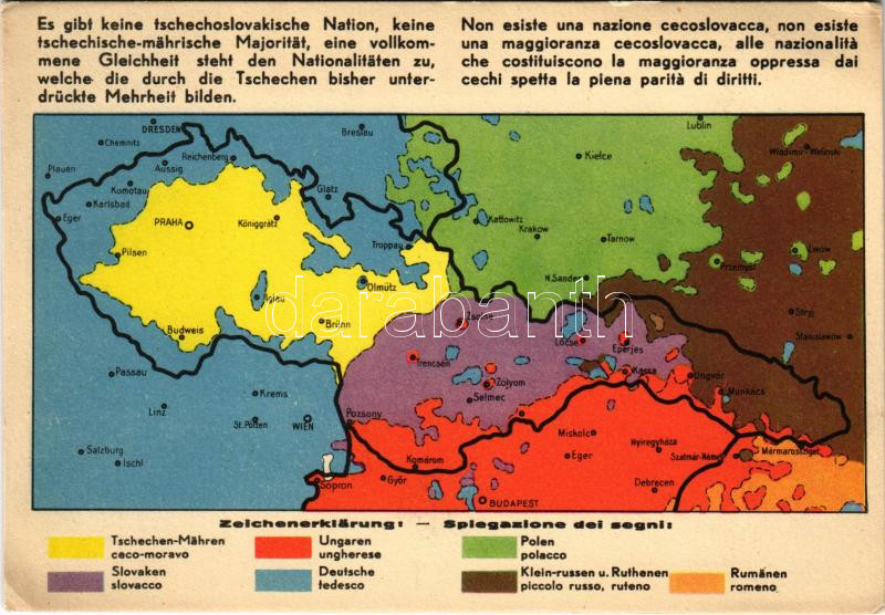 Nincs csehszlovák nemzet, nincs csehszlovák többség, teljes egyenjogúság illeti a csehek által eddig elnyomott többséget alkotó nemzetiségeket. A Magyar Nemzeti Szövetség kiadása / Hungarian Anti-Czechoslovak propaganda, irredenta map (EK)
