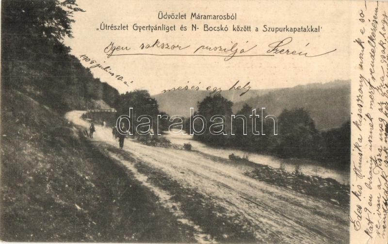 1905 Gyertyánliget, Polyána-Gyertyánliget, Kabola Polyána, Kobyletska Poliana (Máramaros, Maramures); Út részlet Gyertyánliget és Nagybocskó között a Szupurka patakkal. Csermák M. amateur felvétele, Kaufman Ábrahám és fiai kiadása / road between Kobyletska Poliana and Velykyy Bychkiv (EK)