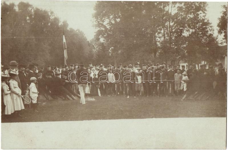 Kötélhúzó verseny magyar katonai csapatok között, népünnepség, előkelő ünneplők és lányok teniszütővel / Tug of war between Hungarian military groups, festival girls with tennis rackets. photo