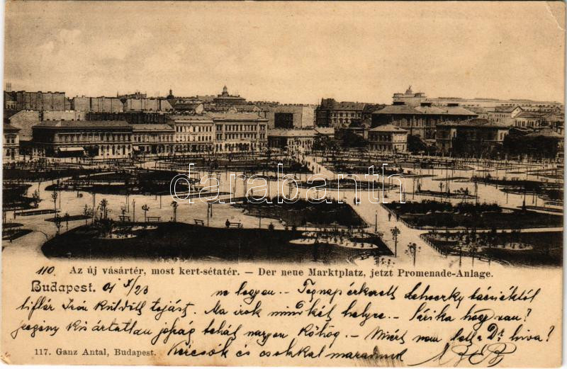 Leírás: 1901 Budapest VIII. Új vásártér, most kert-sétatér (ma II. János Pál pápa tér). Ganz Antal 117. (EK)