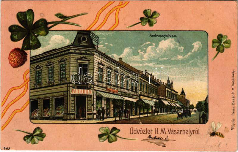 Leírás: 1904 Hódmezővásárhely, Andrássy utca. Szecessziós dombornyomott litho keret lóherével, reisz Bazár kiadása (EK)
