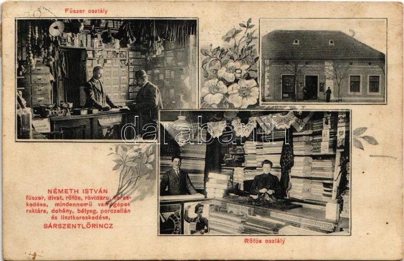 1910 Sárszentlőrinc, Németh István fűszer, divat, rőfös, rövidáru kereskedése, mindennemű varrógépek raktára, dohány, bélyeg, porcelán és lisztkereskedése, üzlet, fűszer osztály, rőfös osztály, belső. Floral (EK)