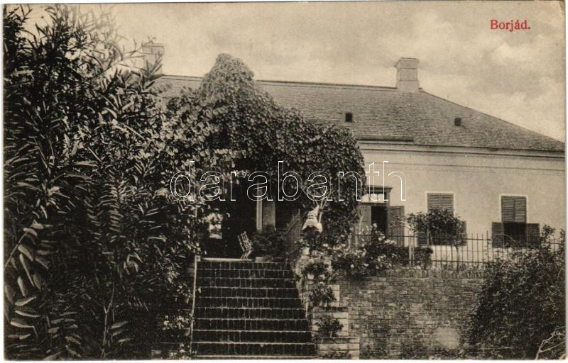 Leírás: 1913 Borjád, Sass kúria kerti törpével, kastély. Hátoldalon Sass László levele és aláírása (EK)