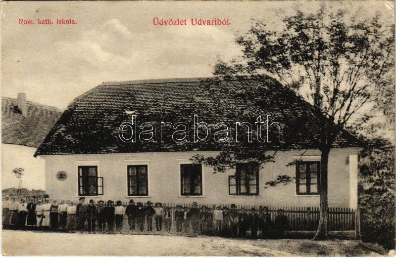 1913 Udvari, Római katolikus iskola. Weisz Aladár kiadása (EK) https://www.darabanth.com/hu/429-Gyorsarveres/429.0/Kepeslapok/Magyarorszag~1500005/1913-Udvari-Romai-katolikus-iskola-Weisz-Aladar-kiadasa-EK~II2749494