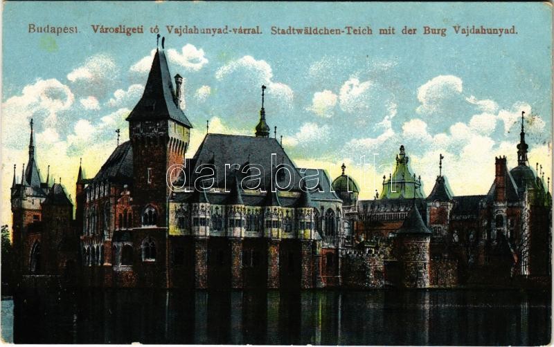 1915 Budapest XIV. Városligeti tó, Vajdahunyad vár + "A magyar szent korona országainak vöröskereszt egylete lábadozó sebesülteket elhelyező bizottságának fővárosi gyermekkert otthona" bélyegzés
