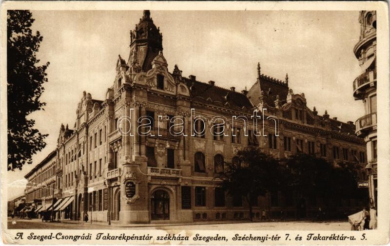 1930 Szeged, Szeged-Csongrádi Takarékpénztár székháza. Széchenyi tér 7... https://www.darabanth.com/hu/429-Gyorsarveres/429.0/Kepeslapok/Magyarorszag~1500005/1930-Szeged-Szeged-Csongradi-Takarekpenztar-szekhaza-Szechenyi-ter-7-es-Takarek-utca-5~II2668342