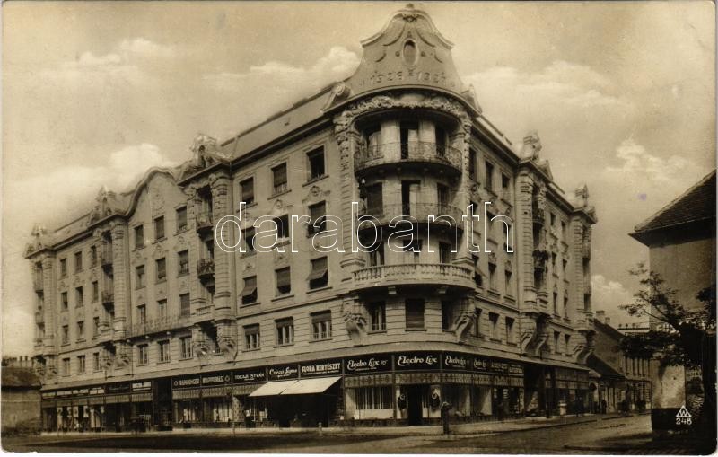 Leírás: 1932 Debrecen, Szent Anna utcai városi bérház, Electro Lux üzlet, Almássy Dezső, Tóth illatszertár, Tokaji István, Ramminger hölgy fodrász