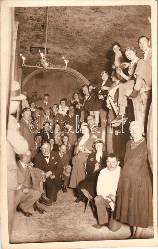 Leírás: 1934 Diósd, MÁV borpince belső, italozó társaság hordókon. photo