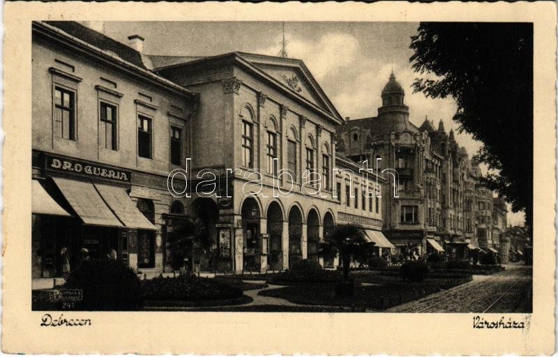 Leírás: 1935 Debrecen, Városháza, Drogueria, Kontsek Konrél, Tóth Gyula, Griczmann üzlete