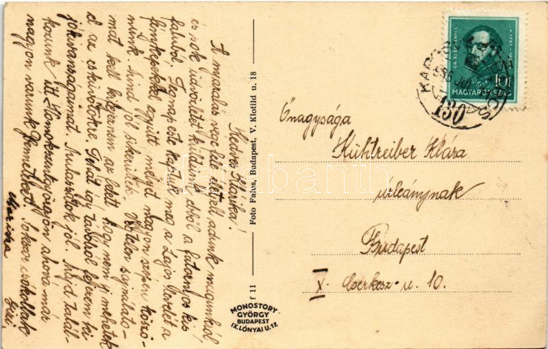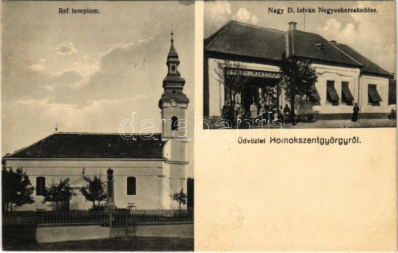 1935 Homokszentgyörgy, Homok Szt. György; Református templom, Nagy D. István vegyeskereskedés üzlete, hősök szobra + "KAPOSVÁR-BARCS 130." vasúti mozgóposta