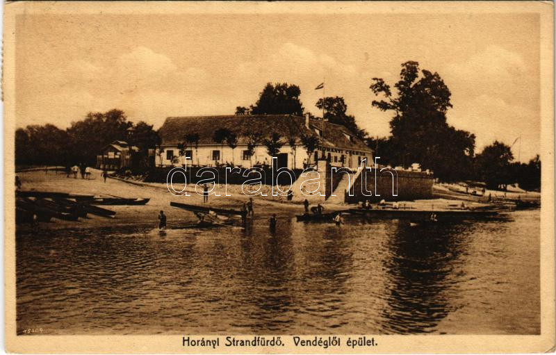 Leírás: 1940 Horány (Szigetmonostor), strandfürdő, vendéglői épület, Horányi csárda, étterem, fürdőzők, csónakok. Fortuna nyomda + "HORÁNY POSTAI ÜGYN." (fl)