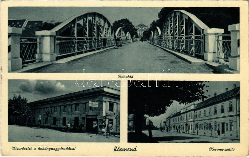 Leírás: 1940 Körmend, Rába híd, utca, dohány nagyáruda, Korona szálloda és étterem