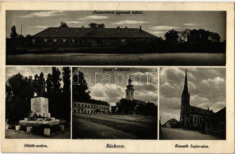 1941 Ráckeve, Ferencvárosi gyermek üdülő, Hősök szobra, emlékmű, Szent István tér, Kossuth Lajos utca, Római katolikus templom, Református templom. F. Kenessey György kiadása