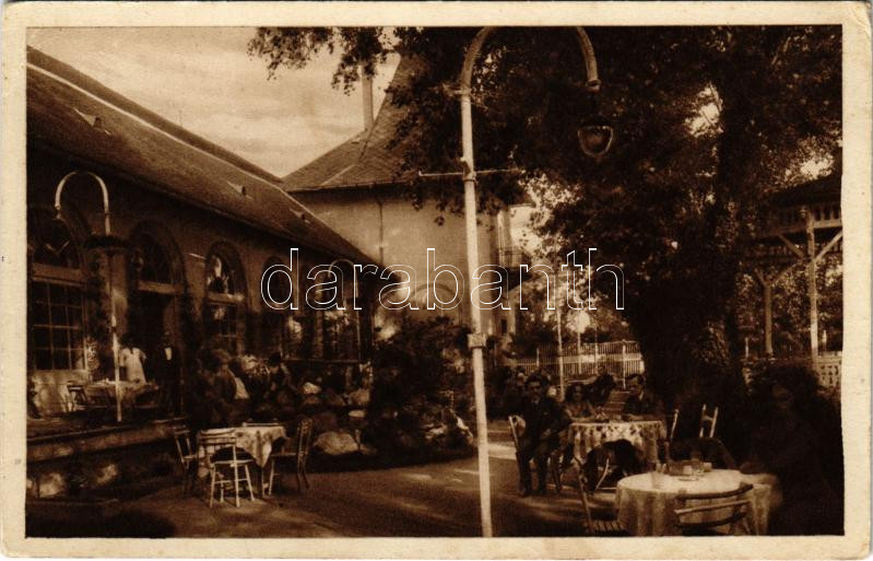 Leírás: Budapest II. Budagyöngye vendéglő és kávéház, kert vendégekkel. Budakeszi út 11. (EK)