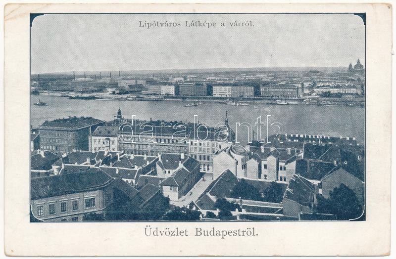 Leírás: Budapest V. Lipótváros látképe a várról még az Országház (Parlament) megépülése (1885) előtt (EK)