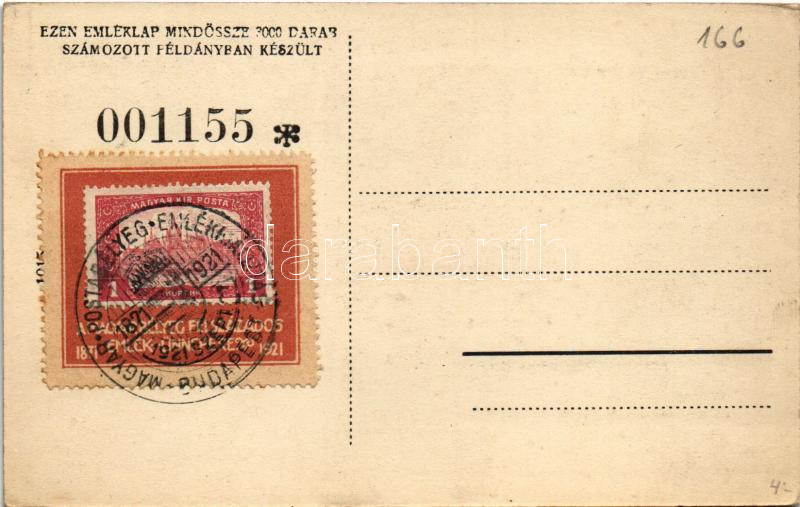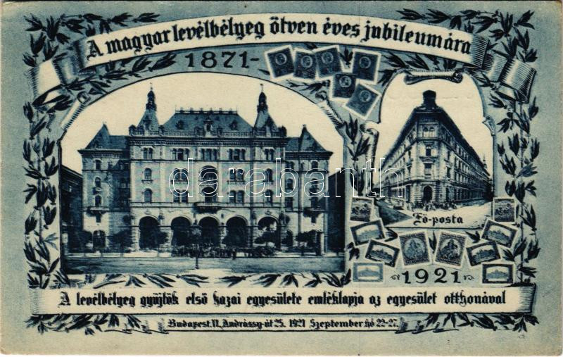 Budapest VI. Andrássy út 25. A magyar levélbélyeg 50 éves jubileumára kiadott emléklap, LevélbélyeggyűjtÅ‘k Egyesületének Otthona, FÅ‘ posta. 1155. számú lap (összesen 3000 darab készült) / The 50th anniversary of the Hungarian postage stamp, Stamp Collectors Association's home, main post office + "Magyar Postabélyeg EmlékkiállÃtás 1871-1921 Budapest" So. Stpl.