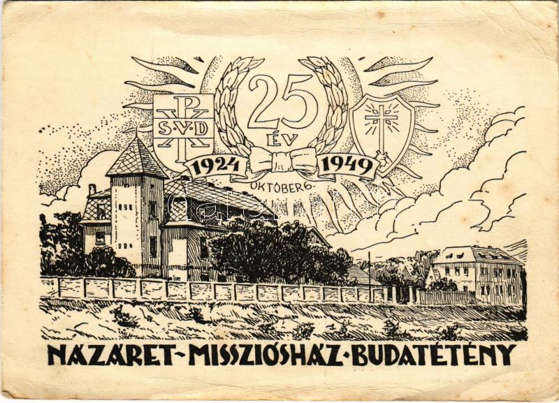 Leírás: Budapest XXII. Budatétény, Názáret Missziósház 25 éves jubileumának emlékére kiadott lap 1924-1949 (gyűrődés / crease)