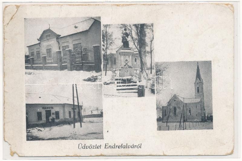 Leírás: Endrefalva (Nógrád), Községháza, Hősök szobra, emlékmű, Római katolikus templom télen, Hangya szövetkezet üzlete és saját kiadása (b)