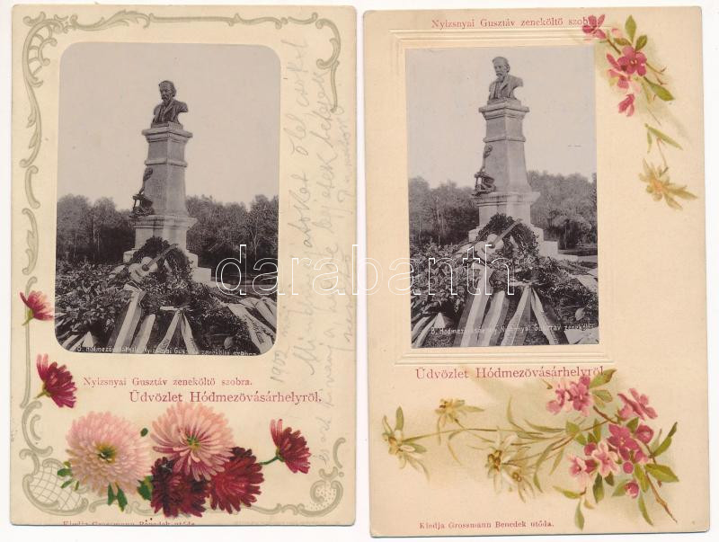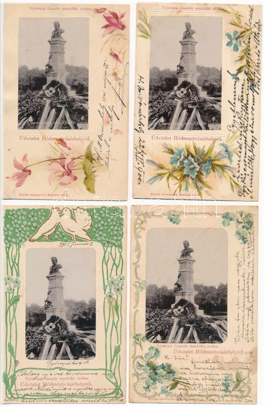 Leírás: Hódmezővásárhely, Nyizsnyai Gusztáv zeneköltő szobor. Grossmann Benedek utóda kiadása - Szecessziós litho teljes képeslap sorozat 6 db képeslappal (egy dombornyomott is) - RITKA!
