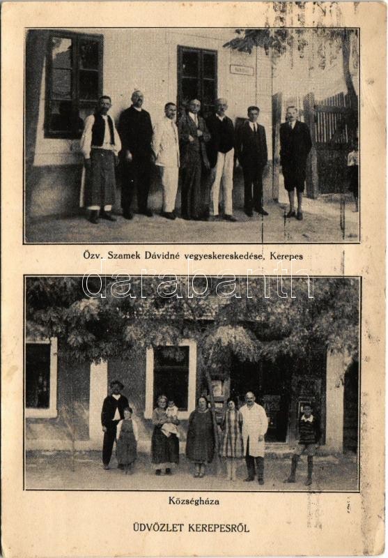Leírás: Kerepes (Pest), Községháza, Özv. Szamek Dávidné vegyeskereskedése. Károlyi Á. fényképész (Rb)