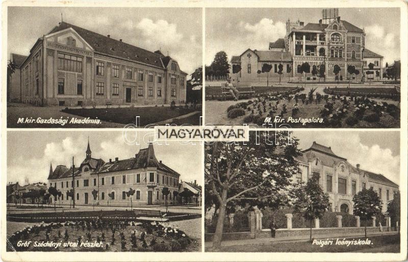 Leírás: Magyaróvár, Mosonmagyaróvár; M. kir. Gazdasági Akadémia, M. kir. Postapalota, Gróf Széchenyi utca, Magyaróvári Bank, Polgári leányiskola (EK)