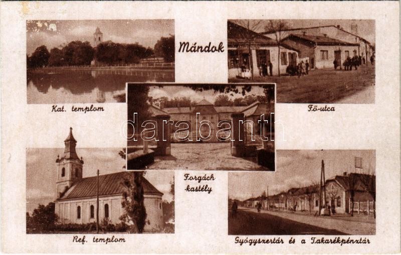 Leírás: Mándok, Katolikus és református templom, Fő utca, Forgács kastély, gyógyszertár és takarékpénztár (Rb)