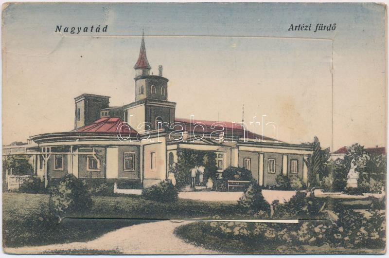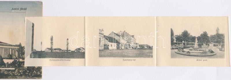 Nagyatád, artézi fürdő. Leporellolap belül Széchenyi tér, Járási takarékpénztár, Kossuth és Hunyady utca, gyógyszertár, méntelep, dohánybeváltó hivatal. Grasselly László kiadása (Rb)